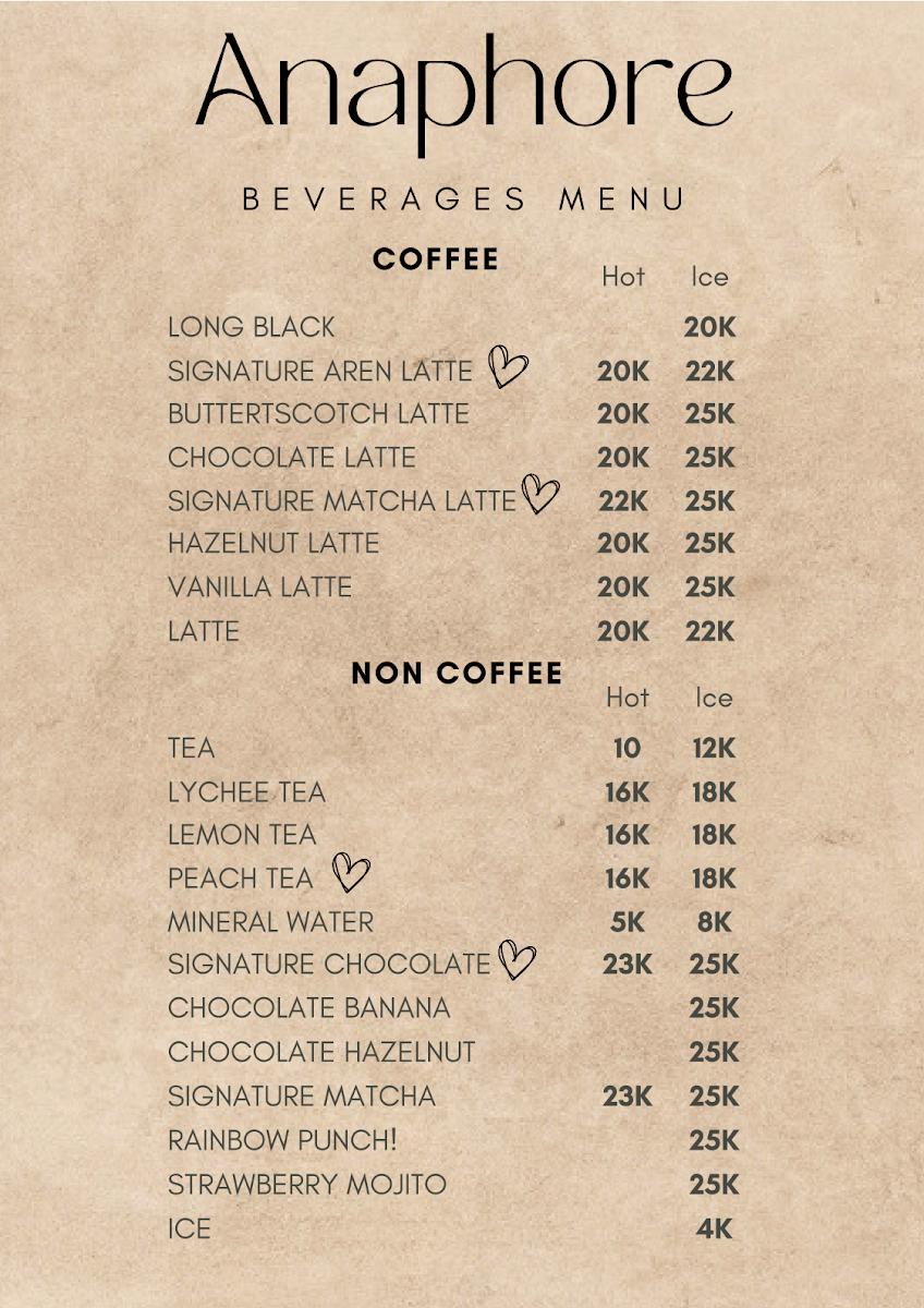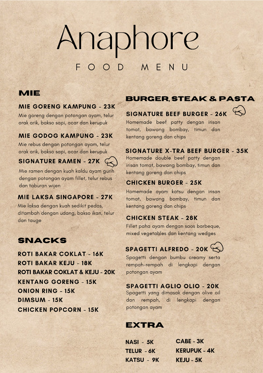 Welcome to Anaphore Coffee & Eatery, a cozy cafe nestled in Pondok Cina, Depok. This charming spot is not just about great coffee; it offers a diverse menu that caters to all palates. Their Mie Goreng Kampung and Signature Ramen are crowd favorites, bursting with flavor and available at wallet-friendly prices. The homemade Signature Burger showcases a juicy beef patty complemented by fresh veggies, perfect for a satisfying meal.